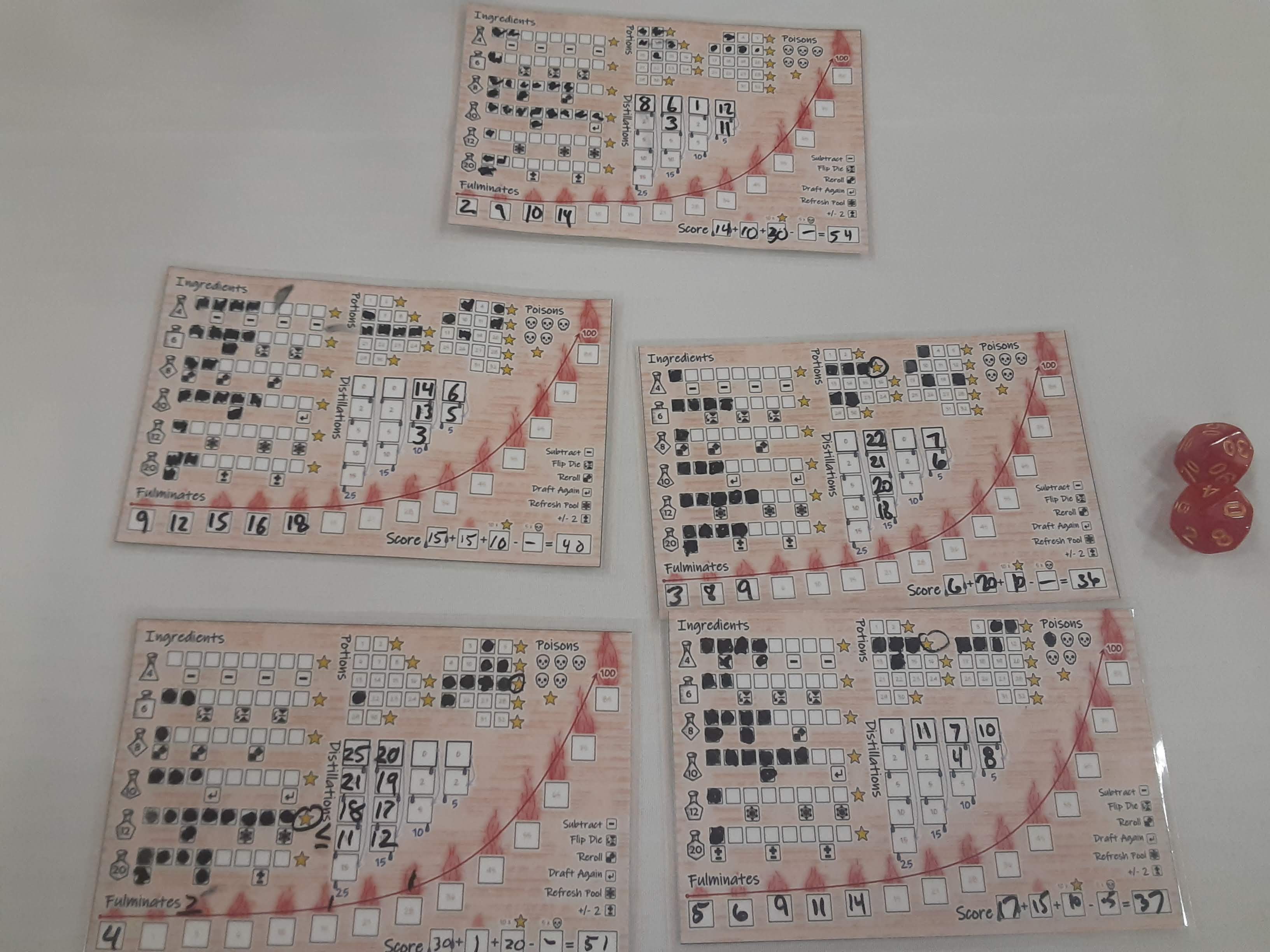 In Polyhedral Potions players take turns drafting two dice from all seven polyhedral dice (ingredients) to make a potion, then mark it as a distillation or fulminate on the various tracks on the sheet. Mechanically it's super simple, but there are a ton of decisions (not overwhelming though) and a few different strategies. All five players were in the running for winning this one. I'm very happy with how well this is playing!